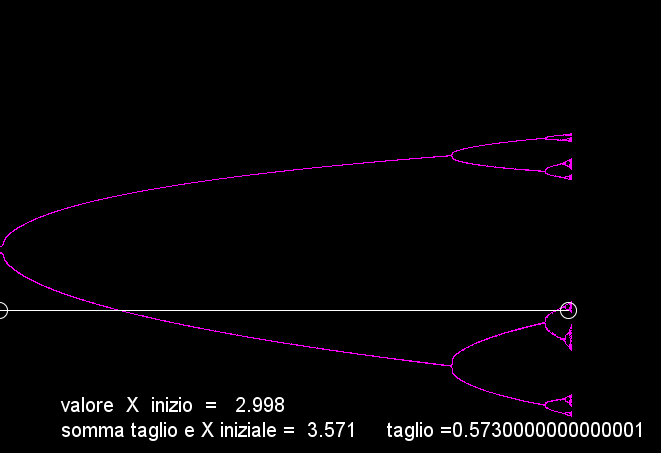 I numeri alla base dei seguenti grafici rappresentano nell'ordine dall'alto in basso, i valori di X che corrisponde al tasso di crescita iniziale (r), segue il nuovo valore di X scelto come tasso(r)di crescita situato al centro del cerchio bianco, mentre il terzo valore corrispondente alla linea bianca che li unisce ossia la distanza (r) tra i due punti. -- In questa immagine si parte da un valore di 2,7603 ed a ogni incremento di (r) la curva si sposta a destra, la popolazione aumenta senza grandi sobbalzi fino a quando giunge a un livello di (r) molto vicino a 3, nota i valori sotto il grafico; a questo punto la popolazione comincia a stabilizzarsi su due valori, una generazione aumenta, quella seguente diminuisce, il che corrisponde ai 2 valori stabili, visti nel grafico sopra, ecco perciò che la curva si divide e forma una specie di Y sdraiata, questo altalenarsi tra 2 valori prosegue fino a quando r raggiunge un valore vicino a 3.45.... |